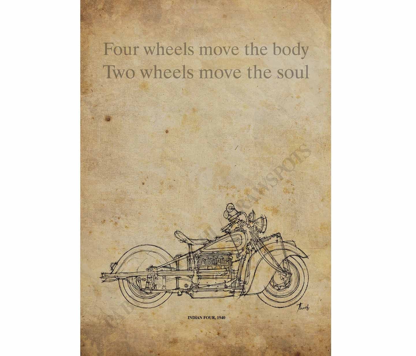 Indian Four,1940,Custom QUOTE,"Four wheels move the body, two wheels move the soul", Handmade Drawing Print, 8x11, Price 27.00 USD (Listed on: September 29, 2014 at 05:44PM)