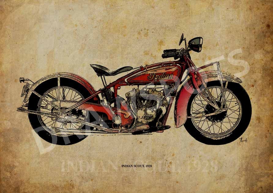 INDIAN SCOUT 1928 - Original Handmade Art Print - Serie of Classic Motorcycles - Paper size A3: 11.5x16 in. (29 x 41 cm), Price 42.00 USD (Listed on: April 24, 2015 at 02:44PM)
